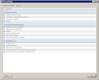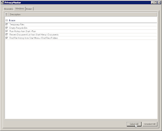 Setelah menggunakan computer, pasti kita meninggalkan jejak. Kalau jejaknya tidak terlalu penting, pasti aman-aman saja. Sangat berbahaya bila jejak yang ditinggalkan adalah hal-hal yang sangat pribadi. Orang lain bisa membuka dan melakukan apapun dengan informasi yang kita tinggalkan. Memang, secara manual bisa diatasi. Namun, tentu saja akan memakan waktu yang agak lama. Untuk menghemat waktu, tentu saja perlu sebuah aplikasi untuk membersihkan semua jejak yang kita tinggalkan setelah menggunakan computer. Salah satu aplikasi yang bisa digunakan secara gratis adalah PrivacyMaster. Aplikasi ini mampu membersihkan jejak saat kita menggunakan windows maupun browser (internet explorer atau firefox). Cara menggunakannya: Buka PrivacyMaster yang telah diinstal.